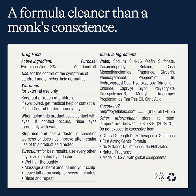 • A Formula Cleaner Than a Monk's Conscience: No sulfates, no parabens, no PEGs, no harsh ingredients that actually make dandruff worse. We designed a formula to stop dandruff and strengthen hair because no one should be worried about hair loss, a flaky scalp, or wearing black shirts.