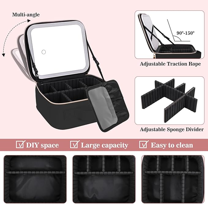 Makeup Case with LED Mirror,Makeup Organizer Bag Travel Makeup Case Large Makeup Bag With Rechargeable Mirror 3 Color Lights Detachable Mirror for Women Beauty Tools Accessories(Black)