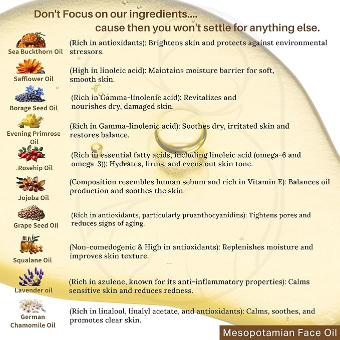 • BOTANICAL FACE OIL WITH OMEGA 3,6,7,9 — Crafted with 10 powerful plant-based oils, including Rosehip and Sea Buckthorn, naturally rich in Omega 3, 6, 7, and 9, along with vitamins and essential nutrients. This lightweight face oil for women deeply hydrates and nourishes, supporting soft, smooth, and healthy-looking skin. Formulated with plant-derived squalane, sourced from olives for a lightweight, silky finish.