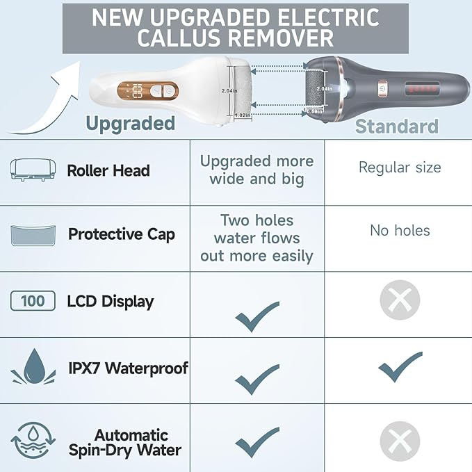 • 🌟【Upgraded Electric Foot Callus Remover,More Powerful,Faster】 ━ New & Improved callus remover for feet giving you 2x more power than other rechargeable brands. See for yourself, when you try it! Charge once and use multiple times, no need to keep it plugged in. It's portable, lightweight, and the perfect, travel-friendly gift set for both men and women.With this foot care tool, you'll say good-bye to cracked heels and hello to your favorite sandals. Pamper your feet with spa-like pedicure in the comfort of your home. Watch years of callused, dry, hard skin give way to baby-soft, smooth skin in minutes.
