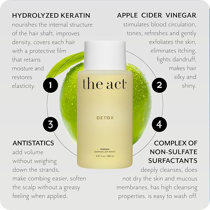 • 💦 Deep Detox for Hair and Scalp: The Act detox shampoo provides deep cleansing that ordinary shampoos can’t achieve, removing buildup from styling products like silicones. These impurities can make hair heavy and dull, which is why periodic detox is essential for vibrant, light, and manageable hair. Use this shampoo to restore your hair’s natural luster and help it regain a healthy, smooth appearance.