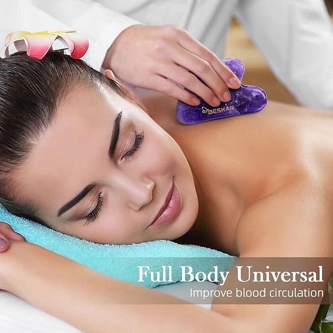 • Excellent Materials: This gua sha massager is handcrafted from 100% naturally Amethyst from South Africa. Amethyst belongs to monocrystalline quartz, which has uneven color distribution and irregular sheet-like shape, usually with a natural ice cracks. It contains trace amounts of Fe element, which can efficiently release negative ions and promote blood circulation, perfect for gua sha massage