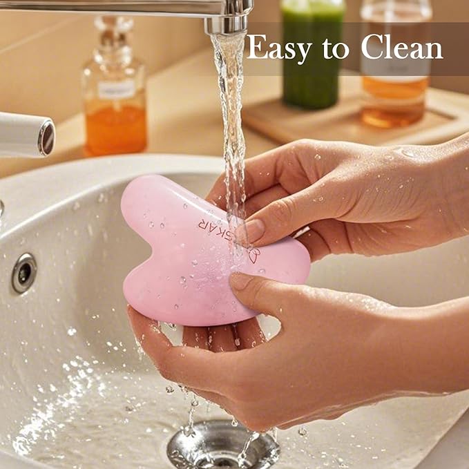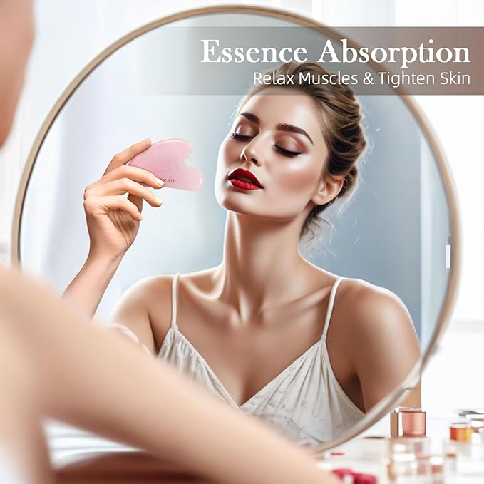 • Excellent Material: This gua sha massager is handcrafted from 100% naturally Rose Quartz from South Africa. Rose Quartz belongs to monocrystalline quartz, which has a pleasant color, symbolizing beautiful love. It has a more smooth surface to better face jawline sculpting and guasha massage, it won't scratch the skin and no squeaky