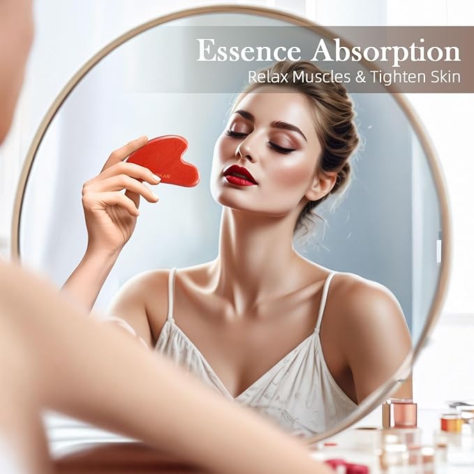 BESKAR Gua Sha Facial Tools, Natural Jade Stone Guasha Massager for Jawline Sculpting, Tighten Face Skin and Reduce Wrinkles, Face Eyes Body Neck Massage Tool, Skin Care Gift (Red)