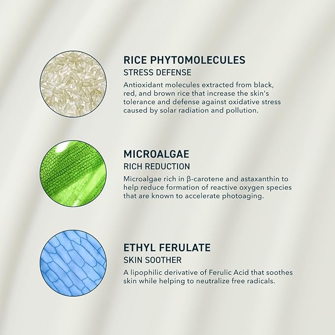 • ANTIOXIDANT SUPPORT: Rice phytomolecules boost skin resilience to UV and environmental stressors, while Microalgae, rich in β-carotene and astaxanthin, support visible skin improvements caused by photoaging. Ethyl Ferulate soothes while targeting impurities for healthier-looking skin