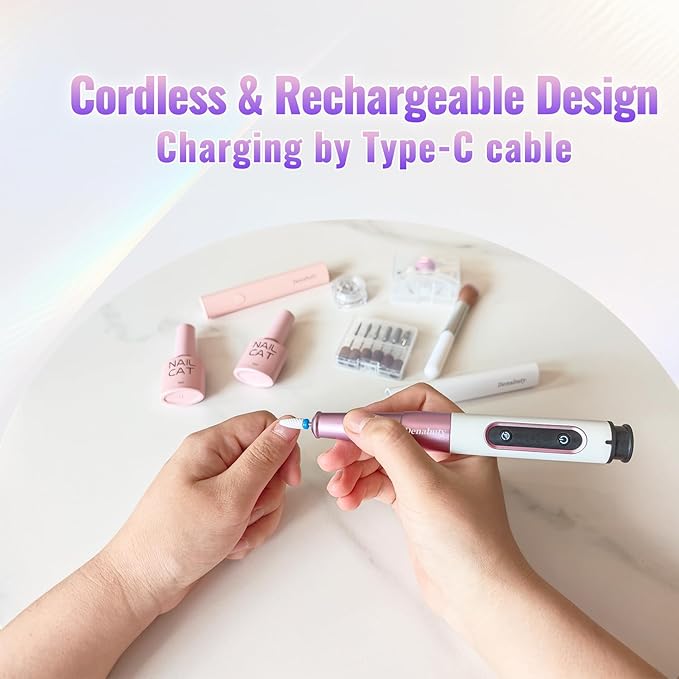 • 【Portable and Lightweight Pen Design】 The Electric Nail Drill compact(158 x 21mm)and lightweight(0.2lb). Experience comfortable and precise nail care with our Cordless Nail Drill Pen's simulation pen design, which is easy to handle and maneuver. the pen clip design minimizing slips and easy to carry.
