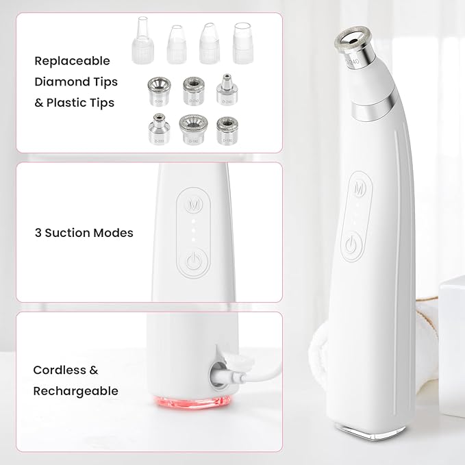 • 【4 Plastic Tips for Blackhead Removal】Specially engineered for the T‑zone and nasal wings, these plastic suction tips dive deep to unclog pores and effectively extract blackheads and whiteheads. Your skin may appear slightly red after use—simply massage in a hydrating toner or cream and redness will fade within an hour, leaving your complexion refreshed and refined
