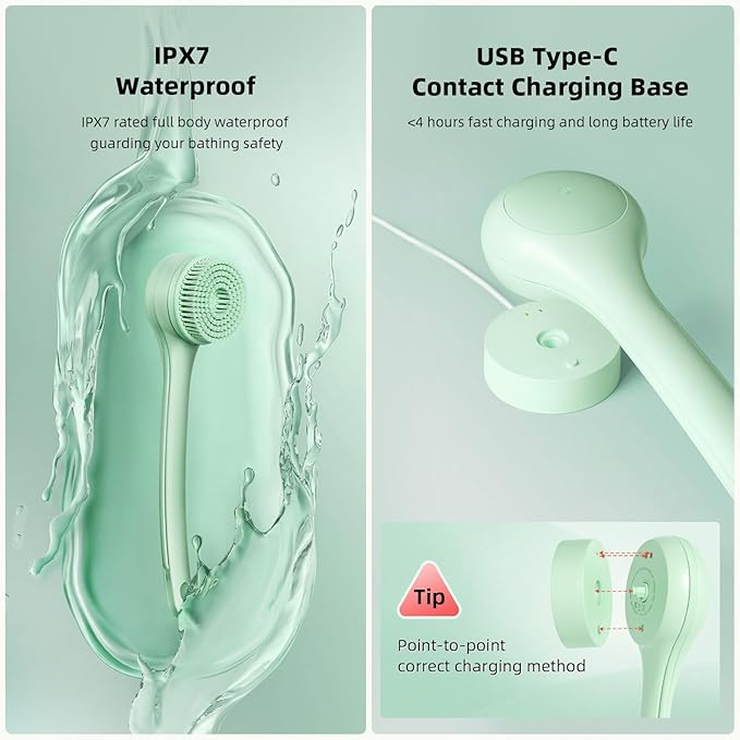 • Wide Application: Comes in a minimalist design gift box. Package includes: bath brush body, 3 brush heads, USB (Type-C) cable, contact charging base, manual and 3 wall accessories. Can be hung with wall-mounted accessories for easy storage without taking up space in the bathroom. This electric body brush works at the touch of a button, available in 4 colors. Perfect as a gift for a loved one or friend