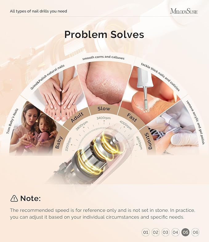 • 8-in-1 Professional Manicure and Pedicure Kit: Experience salon-quality nail care at home with the MelodySusie electric nail drill, featuring 8 versatile drill bits designed to meet all your hand and foot care needs. Effortlessly trim, grind, and polish natural nails, smooth corns and calluses, tackle thick nails and cuticles, or remove acrylic and gel polish. This is a perfect electric nail file kit for women, men, kids, seniors, and even pets, this electric nail file kit is user-friendly for beginners and experts alike.