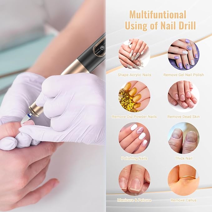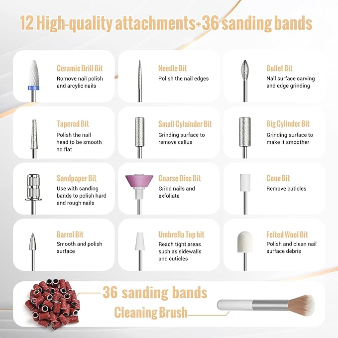 • 【Multi-functional Nail Drill Kit】Denabuty Electric Nail File comes with 12 kinds of metal nail drill bits, 36 pcs sanding bands, 1 cleansing brush, which can meet various nail care needs, such as acrylic nails, gel nails, dip powder nails, natural nails, and cuticle dead skin, calluses, thick nails.