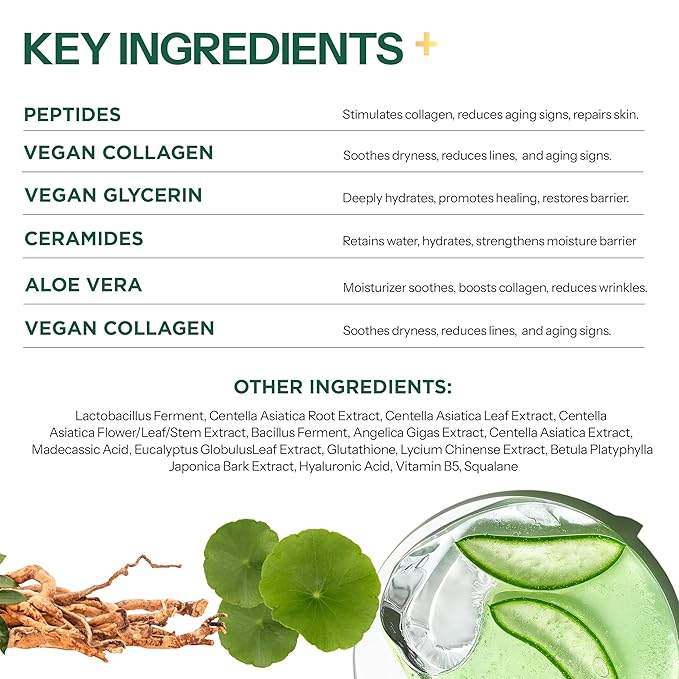 • Active Ingredients : Vegan Glycerin, Squalane, Vitamin B5, Aloe Vera, Hyaluronic Acid, Vegan Collagen, Ceramides, Angelica Gigas Extract Vegan Glycerin, Squalane, Vitamin B5, Aloe Vera, Hyaluronic Acid, Vegan Collagen, Ceramides, Angelica Gigas Extract