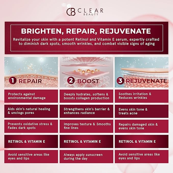 • POWERFUL RETINOL & VITAMIN E – Retinol encourages cell turnover to reveal fresh, vibrant skin, while Vitamin E provides deep hydration, repairs damage, and strengthens the skin’s natural barrier. Together, they promote a healthier, revitalized complexion.