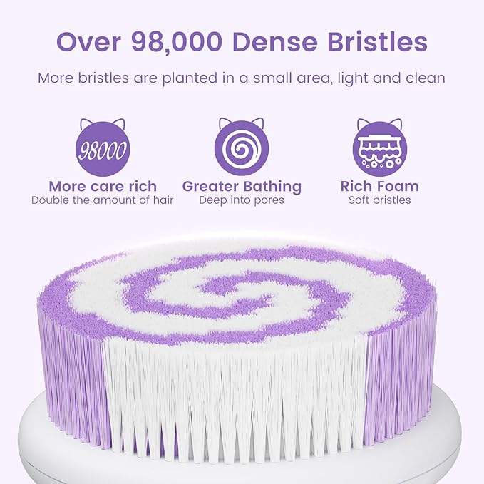 • Dual Brush Heads & Targeted Skin Care: Equipped with two interchangeable heads, this body scrubber meets different body care needs. The cleansing brush features 98,000 ultra-soft bristles that create a rich, delicate lather to deeply remove impurities without irritating the skin. The lotion applicator helps apply body lotion, essential oils, or moisturizers evenly - perfect for gentle hydration and after-shower care