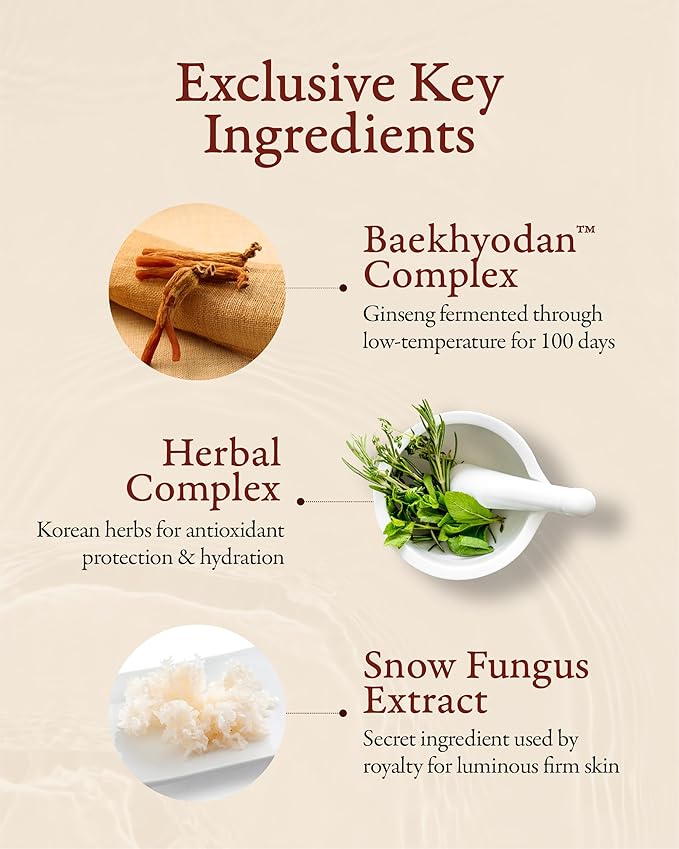 • KEY INGREDIENTS – The formula features Baekhyodan, a proprietary herbal blend fermented in traditional earthenware using wild ginseng from Jirisan Mountain and mulberry-derived Lactobacillus. This advanced herbal concentrate boosts skin vitality and moisture retention. Silver Mushroom extract, known for its powerful hydration capabilities, works to soften and smooth rough, dry skin while restoring natural glow and elasticity.