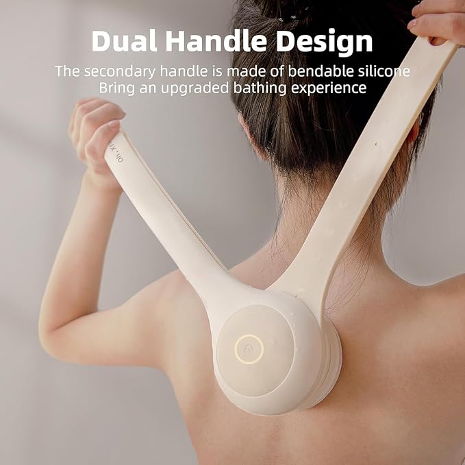 • Unique Dual-Handle Design: This electric body brush is designed with user-friendly double-length handle. The secondary handle is made of bendable silicone, can easily reach and clean your back and other body parts, pampering every inch of your skin, upgrading your bathing experience