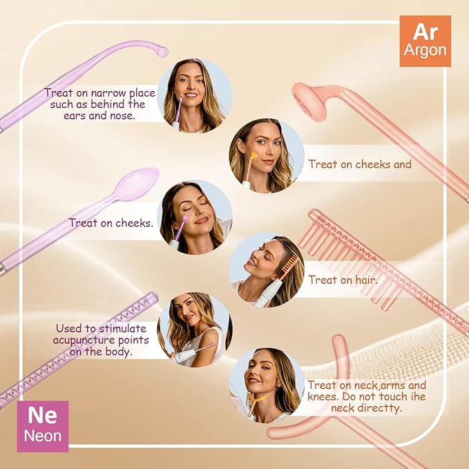 • 6 Professional Applicators for Targeted Results: Face, body & scalp solutions in one kit: mushroom head for full-face revitalization, Y-shape wand for neck/arms, comb for scalp stimulation, tongue/bent tubes for precision areas, and rod applicator for larger surfaces.