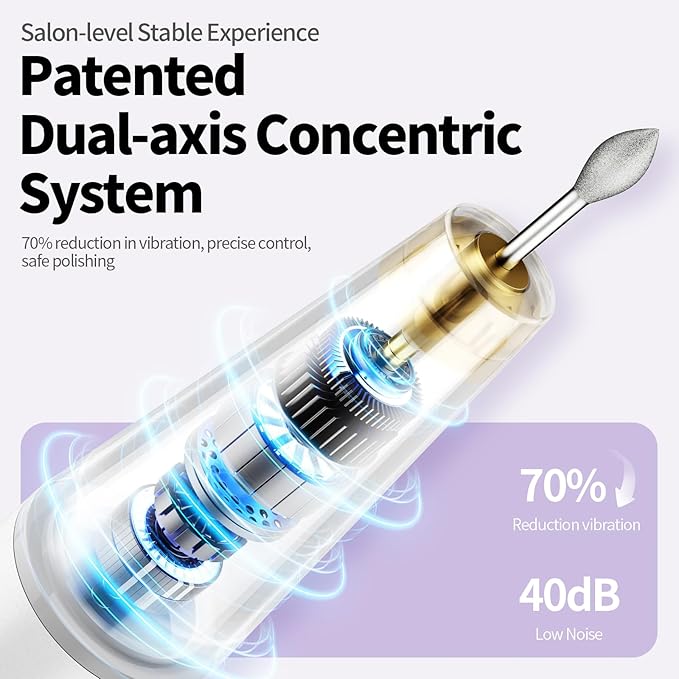 • Double Bearing Concentric System: This professional nail drill features an upgraded 20,000 RPM spring-suspension motor with a double bearing concentric design that cuts vibration by up to 70%. It runs quietly at under 40 decibels and includes built-in overload protection—delivering salon-quality performance with enhanced durability