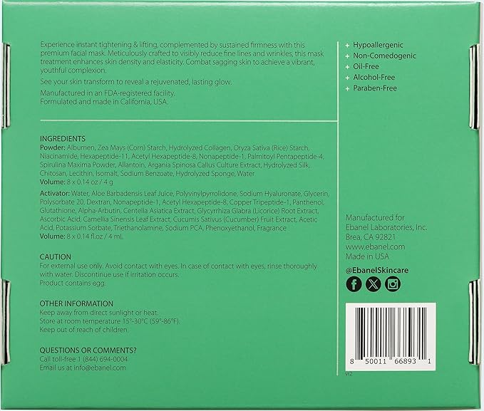 • Made in USA in an FDA-Registered & cGMP-Certified Facility, Dermatologist-Tested - This moisturizing face mask is hypoallergenic, non-comedogenic, oil-free, alcohol-free, and cruelty-free; free from parabens and propylene glycol. This collagen night mask set includes: 1 mixing spatula, 1 application brush, 8 powder sachets (4 grams each), 8 activator sachets (4 mL each), and 8 mixing bowls. This complete face mask kit contains egg (albumen) and marine-derived spicules. Patch test prior to first use and avoid use on broken or irritated skin