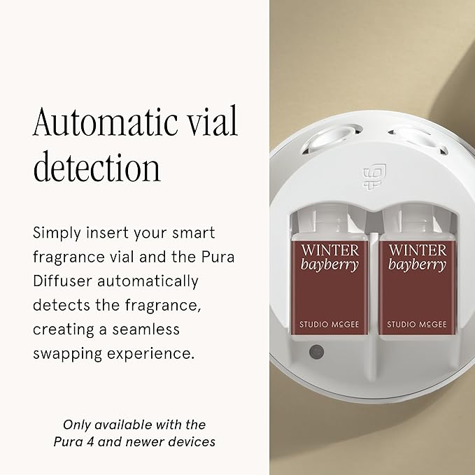 • Long-Lasting Room Scent: When using 2 vials and diffusing 6–8 hours per day at a medium intensity, the Pura 4 diffuser scents last up to 6 weeks in a medium-sized room and the Pura Plus diffuser scents last up to 4 weeks in an open concept space