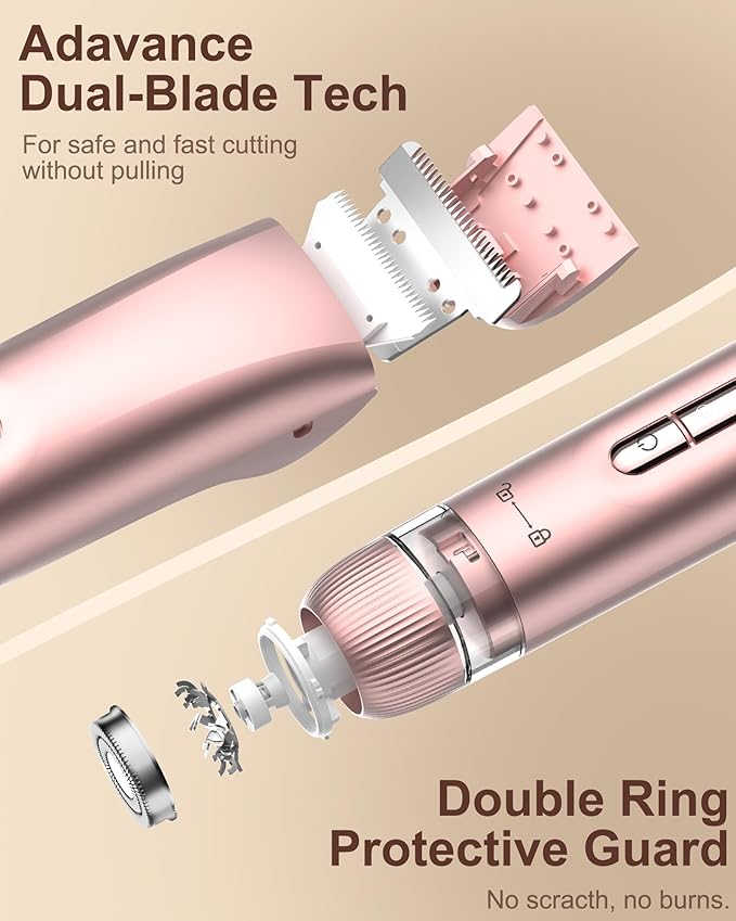 • 🔄【2-in-1 Precision Bikini Shaver】: Say goodbye to multiple tools with our bikini trimmer for women – seamlessly switch between a wide trimmer for the bikini line and a precision head for facial touch-ups. This all-in-one electric shaver for women is perfect for shaping, detailing, and removing unwanted hair from the underarms, face, legs, and intimate areas without nicking or irritation. Whether you're prepping for the beach or fine-tuning before a night out, enjoy salon-smooth skin from head to toe