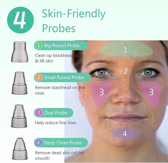 • Tips:Our Blackhead Remover Vacuum with 4 pcs interchangeable suction heads and includes 4 pcs bonus pimple popper tools. They can be rinsed with water to keep them clean