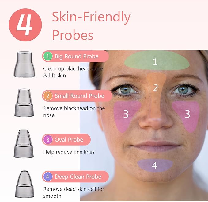 • Tips:Our Blackhead Remover Vacuum with 4 pcs interchangeable suction heads and includes 4 pcs bonus pimple popper tools. They can be rinsed with water to keep them clean