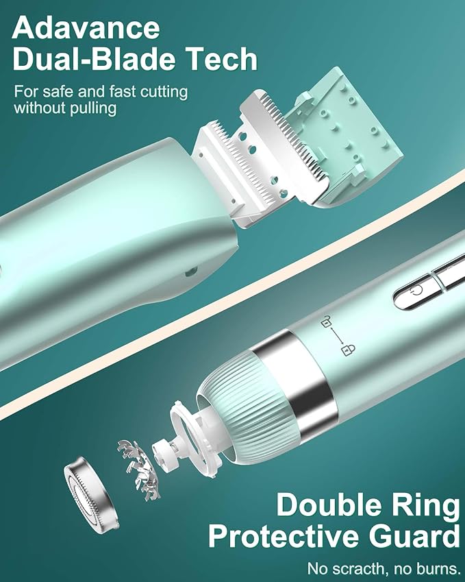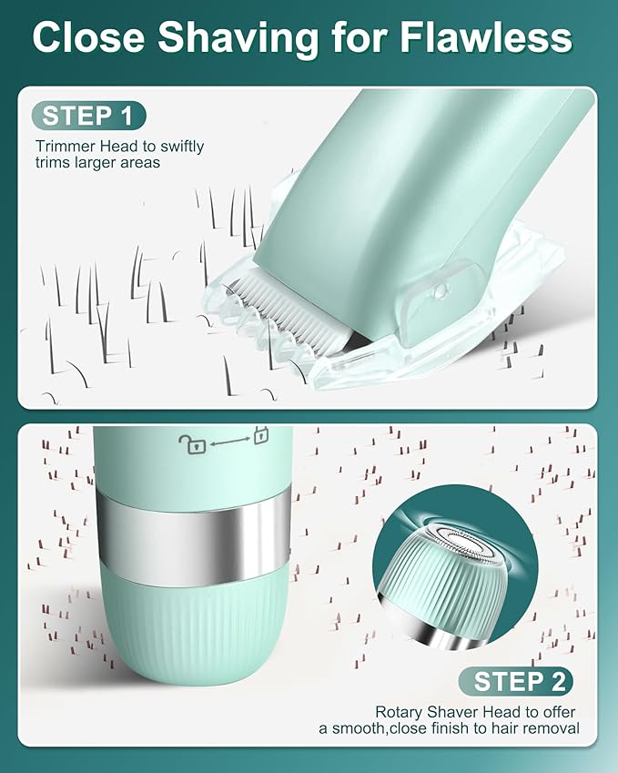 • 🔀 2-in-1 Dual Head Bikini Shaver – This bikini trimmer for women offers a versatile trimmer for women with two specialized heads: a wider blade for efficient body grooming and a precision head for delicate areas like the face and bikini line. Perfect for achieving smooth skin on legs, underarms, upper lip, and more with one effortless tool