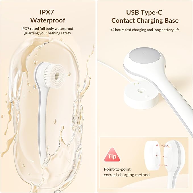 • Two-Speed Electric Bath Brush: Featuring a 360° rotating design with two customizable modes: Gentle mode for first-time users and sensitive skin, and Powerful mode for deep cleansing of oily skin. The intelligent core protection system automatically reduces the brushing strength within 3 seconds if it exceeds safe limits, preventing potential skin irritation