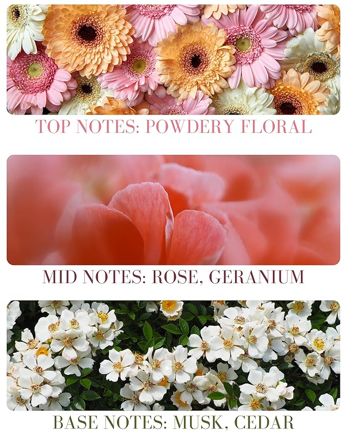 • SCENT PROFILE - Top: Powdery floral Mid: Rose, Geranium Base: Musk, Cedar. Not quite the scent of a newborn’s head, but maybe the next best thing. Powdery floral notes of rose, geranium, ylang ylang and patchouli with just a dust of cedarwood and musk.