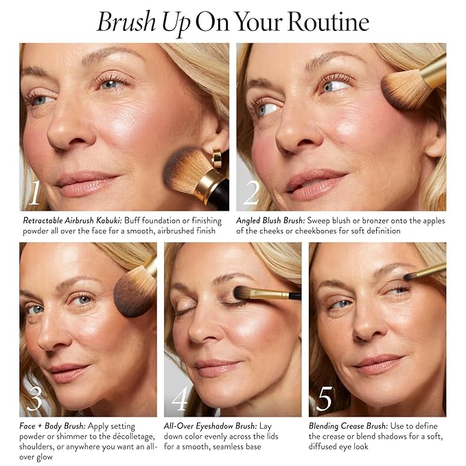 • HOW TO USE: Retractable Airbrush Kabuki Brush: Swirl or dip the brush into powder and gently tap off any excess. Apply to skin using sweeping, circular motions. For fuller coverage, apply using a patting motion. Angled Blush Brush: Sweep blush or bronzer across the apples of your cheeks and blend out toward your hairline. Classic Bronzer Brush: Sweep the bristles over the high points of the face for an all-over glow. All-Over Eyeshadow Brush: Glide the brush over shadow and sweep it across lid