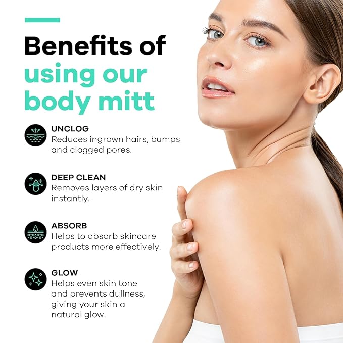 • BODY SCRUBBER FOR SMOOTHER TEXTURE & RENEWAL: This shower exfoliator mitt boosts circulation and supports natural skin renewal. Use weekly to maintain silky, even skin tone and to reduce the appearance of clogged pores or ingrown hairs.