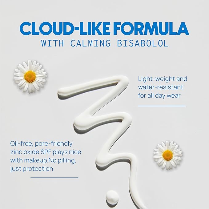 • CLOUD-LIKE FORMULA WITH CALMING BISABOL - This seamless sunscreen disappears as fast as last week’s hookup. Oil-free zinc oxide is a pore-friendly formula that doesn't pill under makeup. Water-resistant all-screen perfect as daily SPF with cloud-like feel.