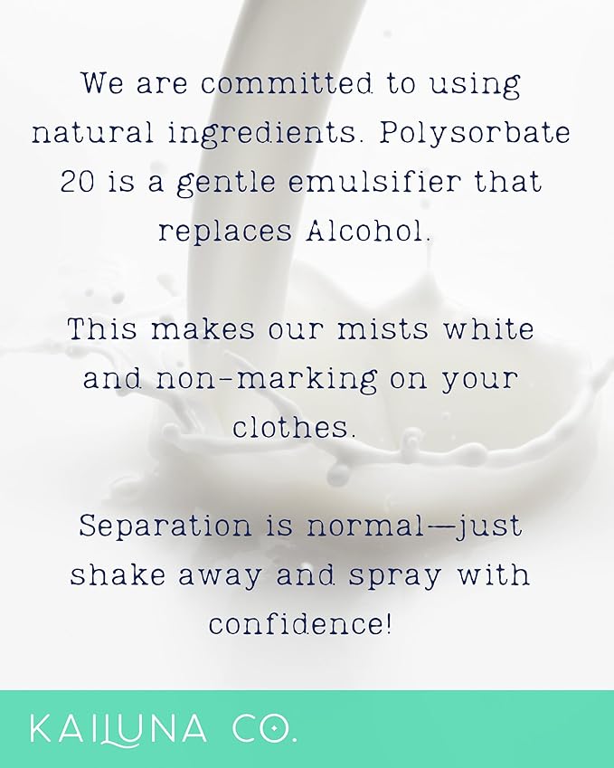 • NATURAL INGREDIENTS - Only simple, natural and effective plant-based ingredients are used in our products. The carrier product in this mist is pure, distilled water. Our carefully sourced fragrance and essential oils are all pure oils with no harmful chemicals.
